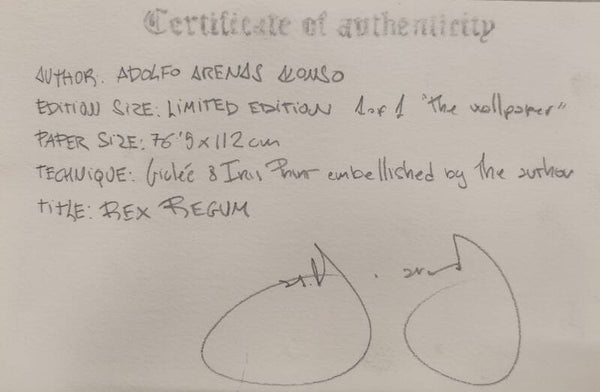 Adolfo Arenas Alonso - Rex RegumEdition size: limited edition 1 of 1 "The hummingbird"Paper size: 76.5 x 112 cmTechnique: Giclée 8 Iris Print embellished by the authorThe little part of wallpaper is hand painted